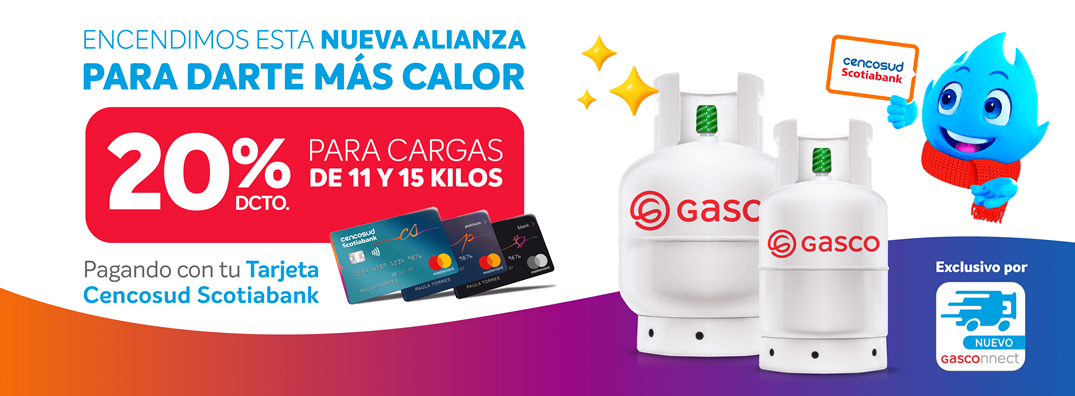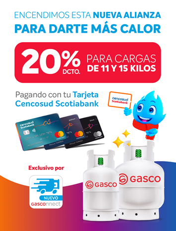 Promoción válida desde el 8/09/2025 hasta el 31/12/2025. Promoción consiste en un 20% Dcto. en Gasco válido para compras de cargas de gas de 11 y 15 Kg a través de la app Gasconnect. El beneficio se hará efectivo al momento del pago, exclusivo enrolando la Tarjeta a través de OneClick y pagando con tu Tarjeta Cencosud Scotiabank.