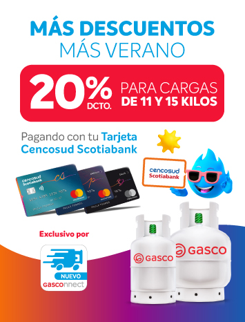 un 20% Dcto. en Gasco válido para compras de cargas de gas de 11 y 15 Kg a través de la app Gasconnect. El beneficio se hará efectivo al momento del pago, exclusivo enrolando la Tarjeta a través de OneClick y pagando con tu Tarjeta Cencosud Scotiabank.