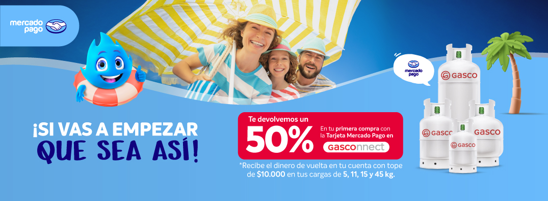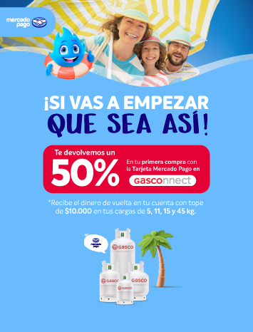 50% OFF (Tope $10.000) para usuarios nuevos de Mercado Pago cuya primera compra sea en Gasconnect. Aplica para cargas de 5,11, 15 y 45 kilos. Campaña valida hasta el 30 de junio. Descuento se hace efectivo en forma de cashback.