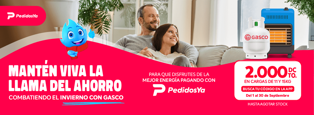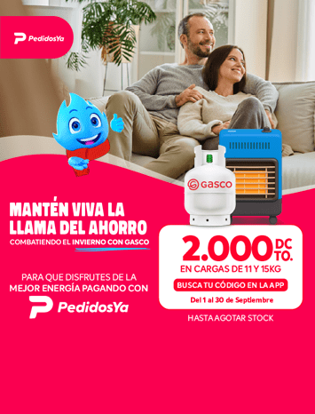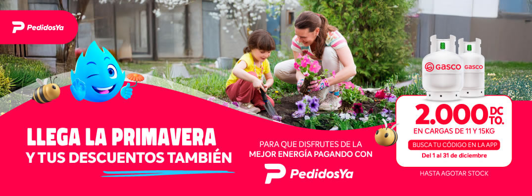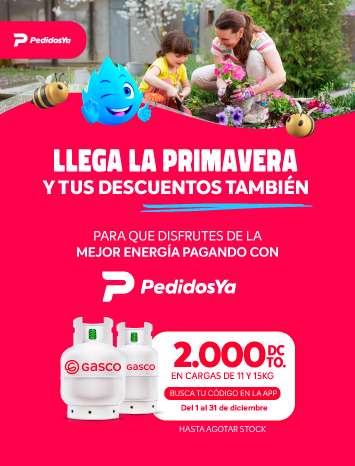 en distribuidores adheridos a App PedidosYa; $2.000 de descuento para todas las compras en formatos de 11 o 15 kilos. Busca tu código en la App de PedidosYA. Máximo 1 cupón por usuario. No acumulable con otras promociones ni descuentos.