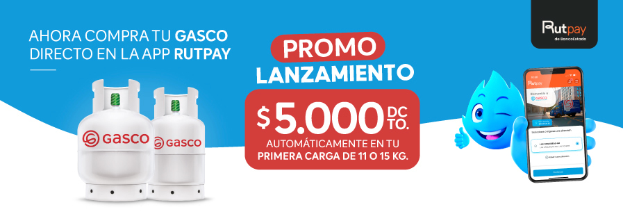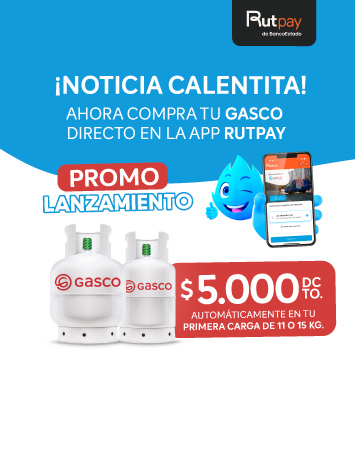 Promoción válida entre el 24 de noviembre y el 23 de diciembre de 2025 para clientes Banco Estado que pagan con Rutpay su carga GASCO con un mínimo de compra de $15.000, no es acumulable con otras promociones, un descuento por rut.