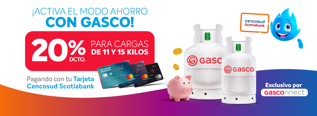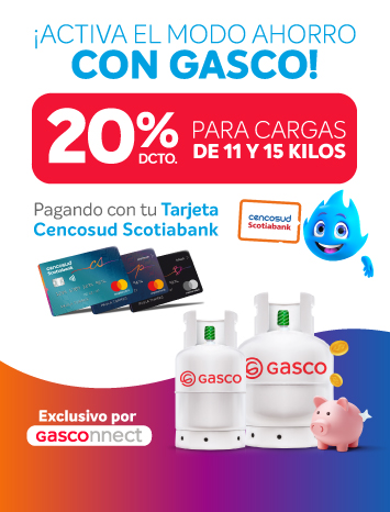 un 20% Dcto. en Gasco válido para compras de cargas de gas de 11 y 15 Kg a través de la app Gasconnect. El beneficio se hará efectivo al momento del pago, exclusivo enrolando la Tarjeta a través de OneClick y pagando con tu Tarjeta Cencosud Scotiabank.