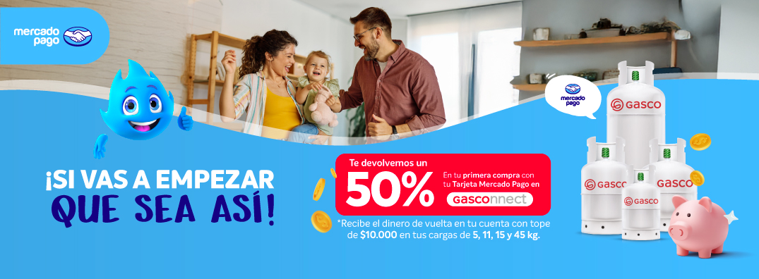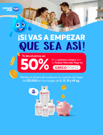 50% OFF (Tope $10.000) para usuarios nuevos de Mercado Pago cuya primera compra sea en Gasconnect. Aplica para cargas de 5,11, 15 y 45 kilos. Campaña valida hasta el 30 de junio. Descuento se hace efectivo en forma de cashback.