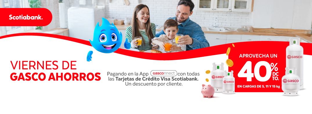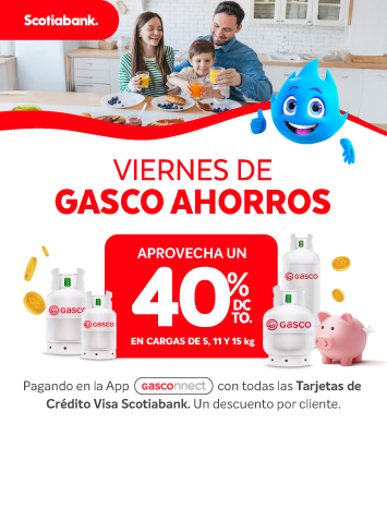 en un 40% Dcto. en Gasco válido para compras de cargas de gas de 5, 11, 15 y 45 Kg a través de la app Gasconnect. El beneficio se hará efectivo al momento del pago, exclusivo enrolando la Tarjeta a través de OneClick y pagando con tu Tarjeta de Crédito Scotiabank Gold, Platinium, Signature, Infinite, Singular y Wealth Management. Máximo 1 carga con descuento por cliente. Promoción no acumulable sobre otras promociones, ni sobre el costo del despacho. Promoción exclusiva clientes Scotiabank. El pago con tarjetas de crédito puede tener costos asociados. Consulta con el emisor de la tarjeta para mayor información.